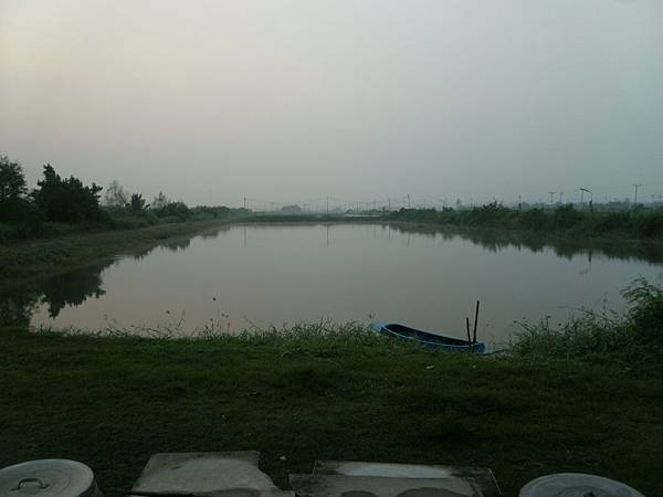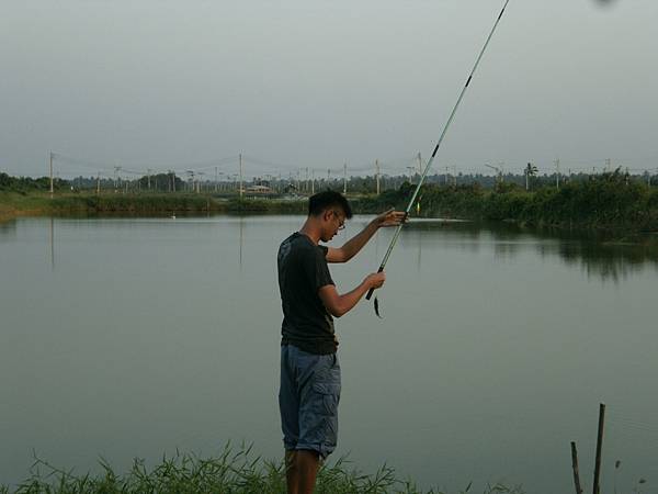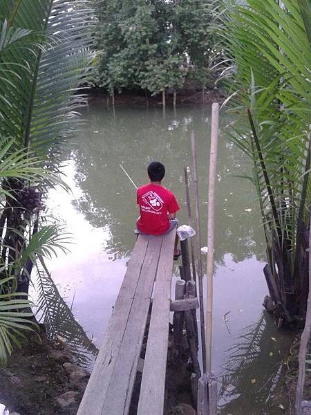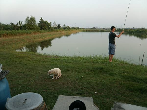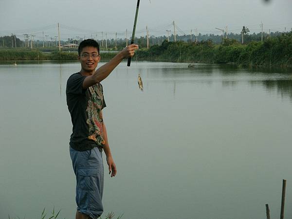 一回到家,馬上招待同學到家中前面的大池塘釣魚囉!