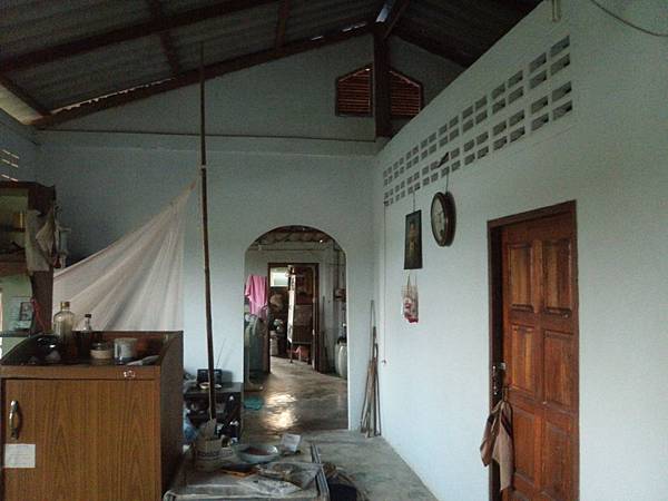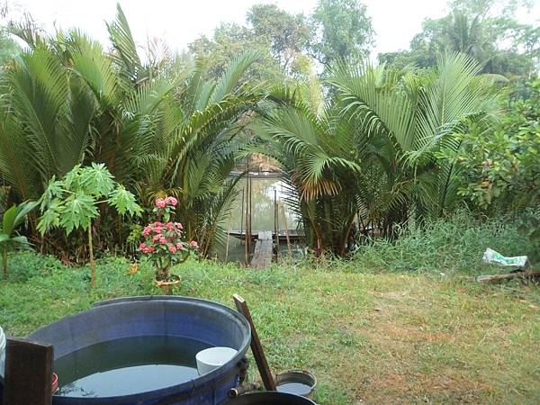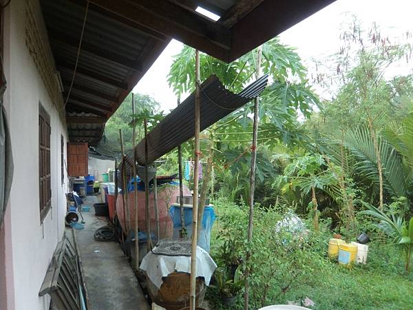 家中的後廊 (可以看到懸空的鐵板是要接雨水用的,而大甕就是雨水儲存的地方)